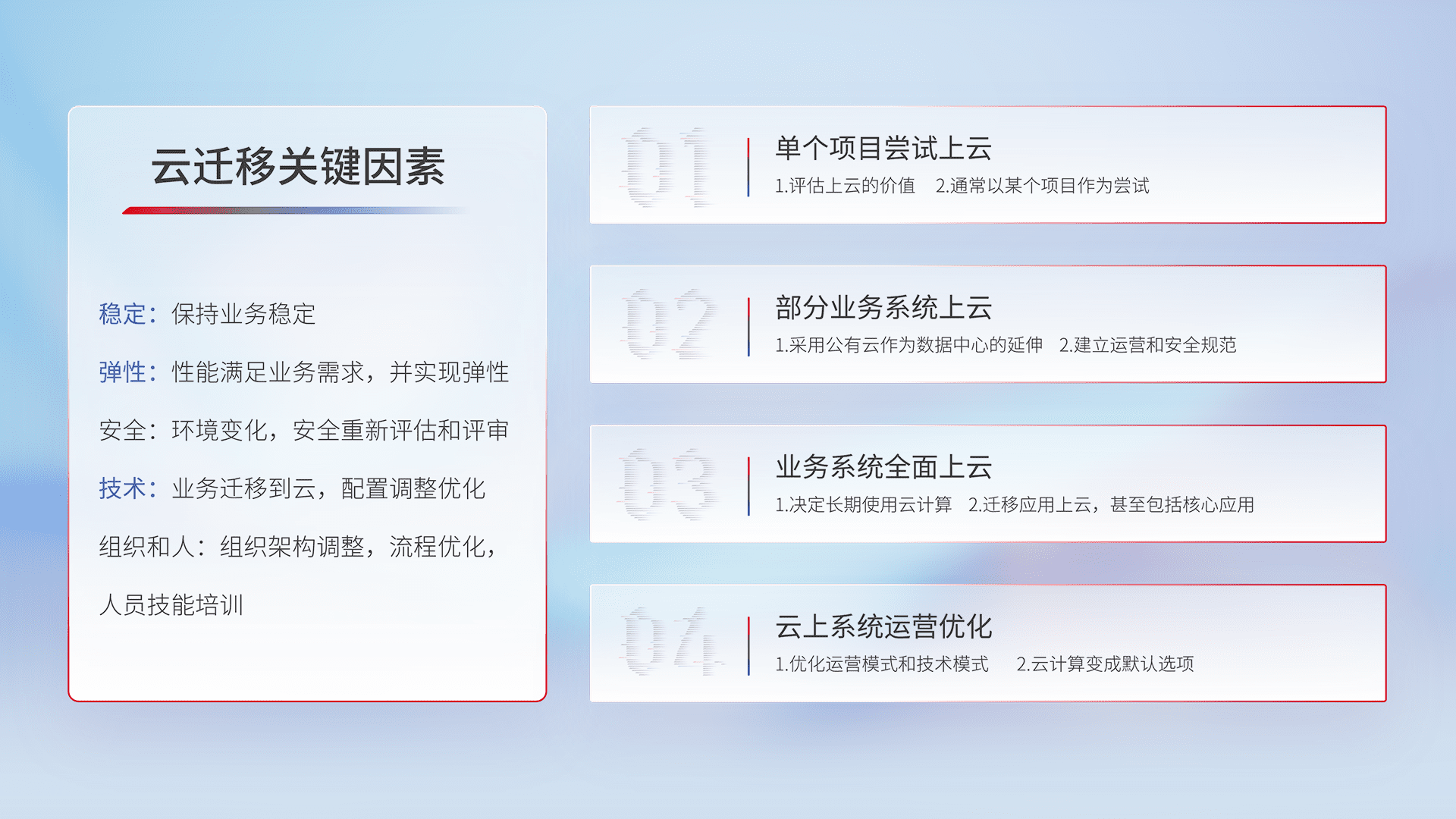 结合实际业务,,,,从规划设计、、、、云平台选型、、、云原生改造、、、、数据迁移、、、集成交付,,,迁移全过程为客户识别最佳上云路径,,,,做好风险识别管理,,,设计网络架构、、身份权限、、、安全审计合规、、操作审计、、、日志审计、、监控告警策略、、、多站点容灾设计等,,对云上基础设施进行整体规划,,提升IT治理水平,,,以满足弹性、、、、高可用、、、、高性能的需求。。